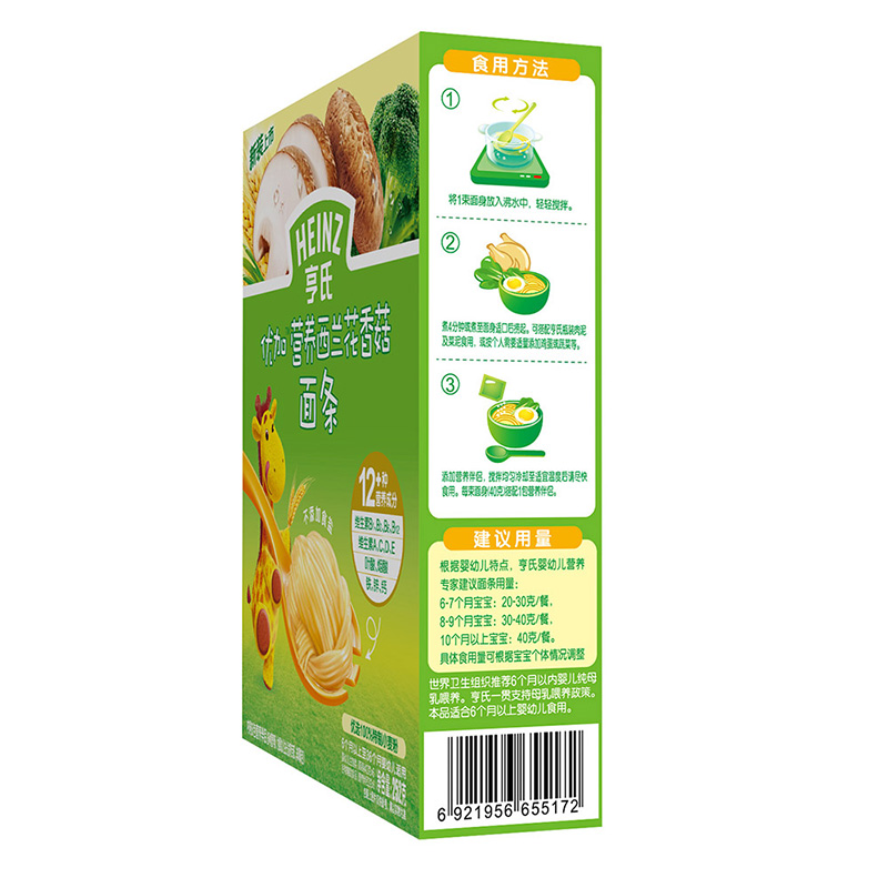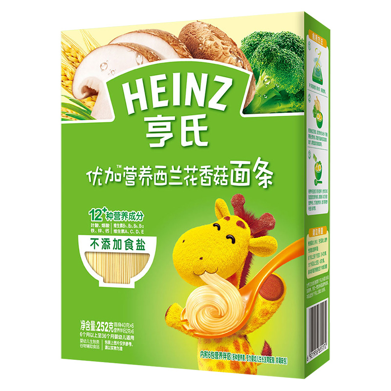亨氏 (Heinz) 1段嬰幼兒輔食優(yōu)加寶寶面條 西蘭花香菇 寶寶營(yíng)養面條336g(無(wú)鹽)(輔食添加初期-36個(gè)月適用)-誠成商貿有限責任公司