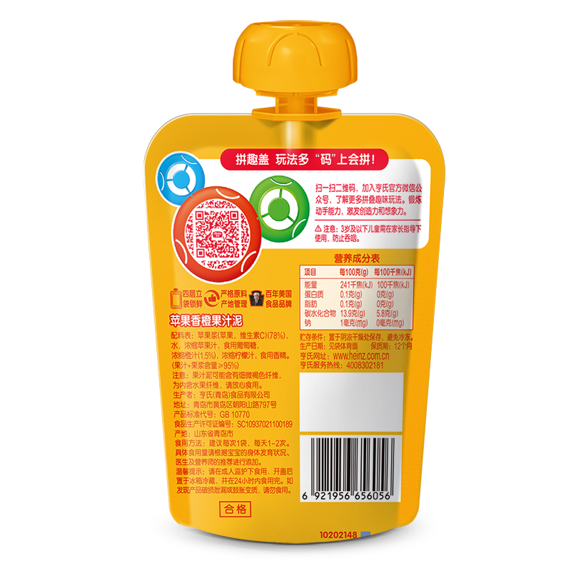 亨氏(Heinz)果汁泥 嬰兒水果泥寶寶輔食泥零食(1-3歲適用) 香橙蘋(píng)果120g-誠成商貿有限責任公司