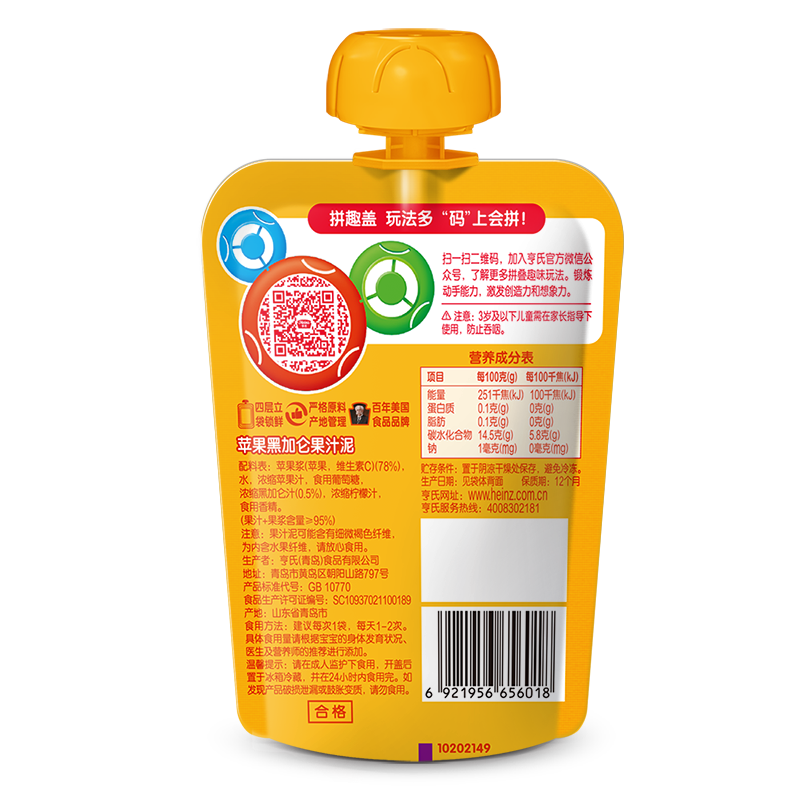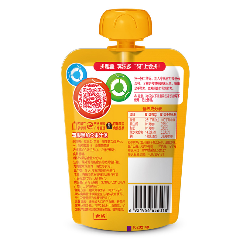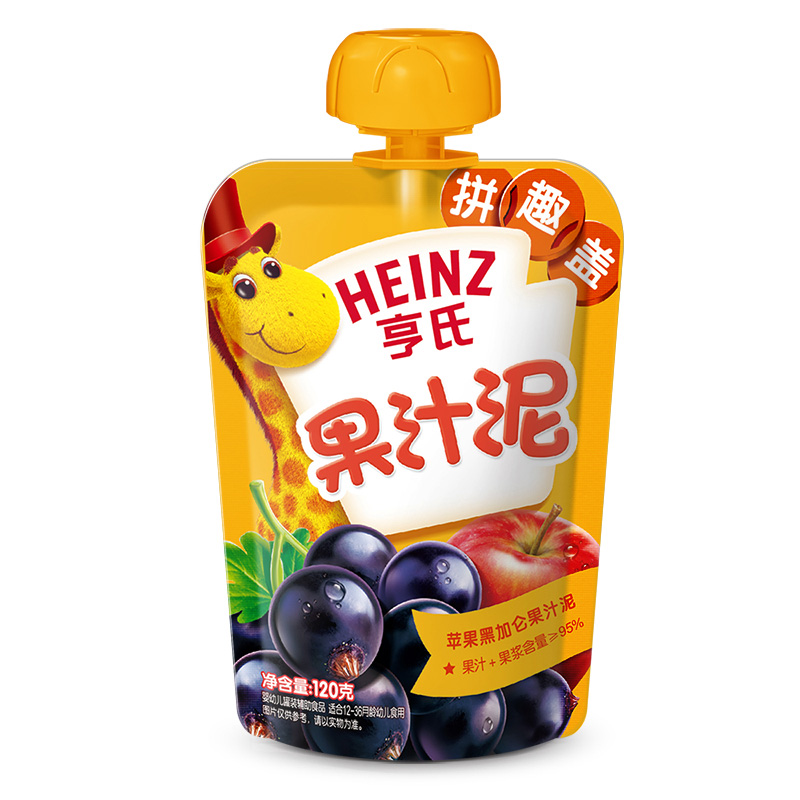 亨氏(Heinz)果汁泥 嬰兒水果泥寶寶輔食泥零食(1-3歲適用) 黑加侖蘋(píng)果120g-誠成商貿有限責任公司