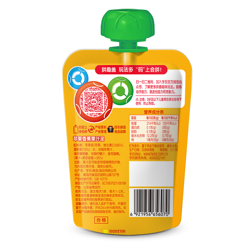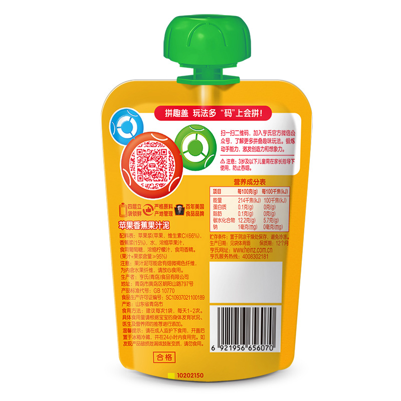 亨氏(Heinz)果汁泥 嬰兒水果泥寶寶輔食泥零食(1-3歲適用) 香蕉蘋(píng)果120g-誠成商貿有限責任公司